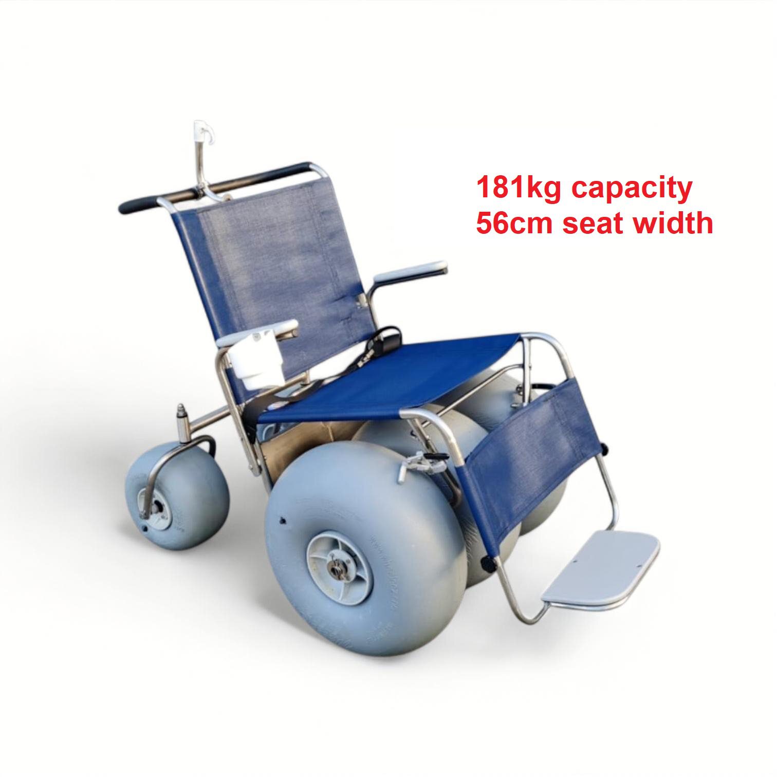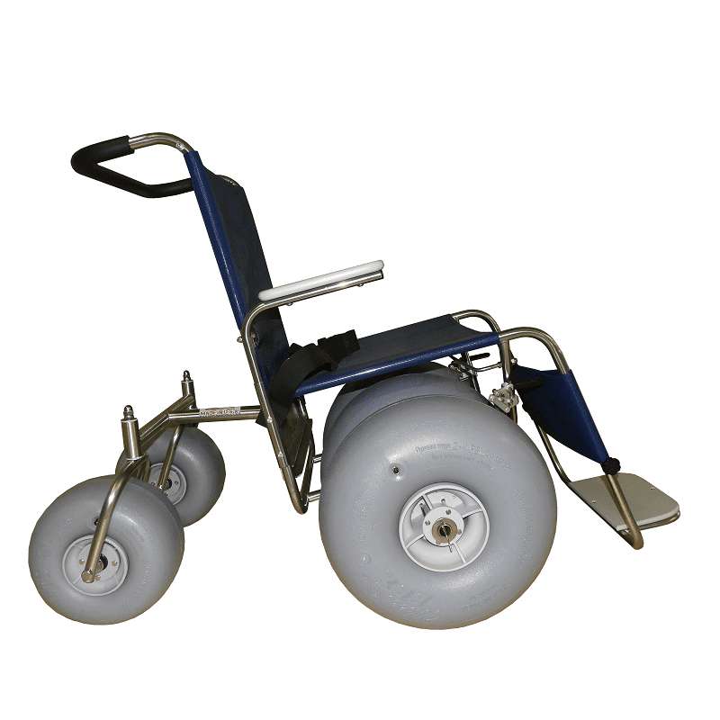 The Husky Beach Wheelchair features a reinforced frame engineered to support higher weight capacities, enhancing both stability